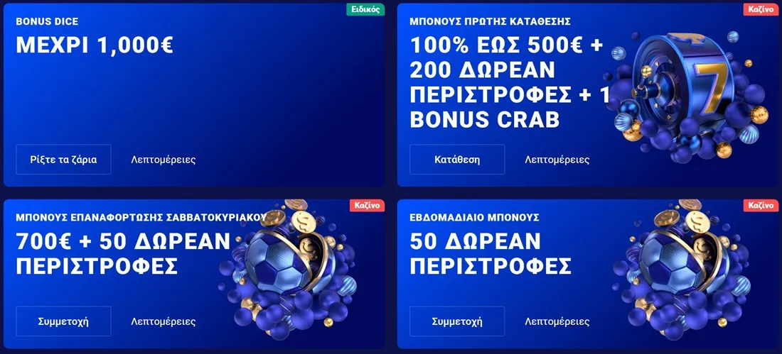 Τα πιο μεγάλα δώρα είναι άμεσα διαθέσιμα με το που ξεκινήσετε. Στην έναρξη του λογαριασμού σας αμέσως αμέσως θα πάρε το πρώτο δώρο κατάθεσης που είναι 100% για χρήματα έως 500 ευρώ και 200 Free Spins αλλά και 1 Bonus Crab. Αντίστοιχα και στον στοιχηματισμό θα βρείτε ένα μπόνους 100% για καταθέσεις έως 100 ευρώ ενά πάρα πολλές παροχές περιμένουν και όσους παίζουν καθημερινά με μεγάλα τουρνουά αλλά και όσους γίνουν VIP με εξατομικευμένες προσφορές αποκλειστικά για εσάς , σύμβουλο προσωπικό σε θέση μάνατζερ και μεγαλύτερες αποδόσεις.
